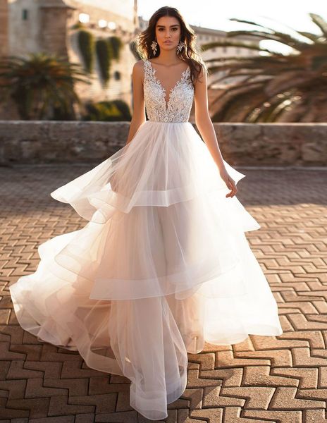 Discount Sexy Deep V Neck Wedding Dresses Tiered Skirt 2019 Bridal Gowns Low Back Appliqued Country Style Wedding Gowns Wedding Gown Designs